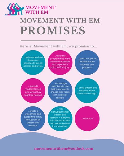 Movement with Em is a family that encourages movement and fitness for all ages and abilities, whether you have done exercise all your life or if this is your first time. It offers a range of exercise and fitness styles to suit all. Every class and session is taught in layers, the first layer always being possible for everyone.